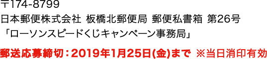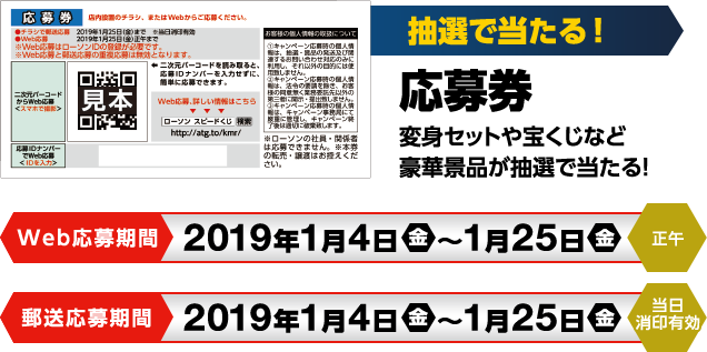 郵送応募の場合は、2019年1月4日(金)から同年1月25日(金)消印有効です。 - WEB応募の場合はその場で抽選結果がわかります。郵送応募の場合は景品の発送をもって発表にかえさせていただきます。
