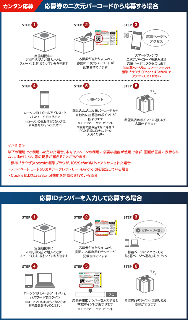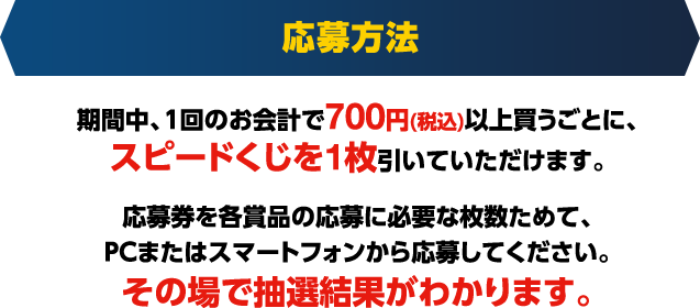 - 本キャンペーンは、税込700円お買い上げ毎に1回引けるスピードくじの応募券に記載された応募用IDナンバーをご希望のコースに必要な枚数分を登録し応募。応募者の中から抽選で、景品をプレゼントするキャンペーンです。また本キャンペーンは郵送での応募も可能です。