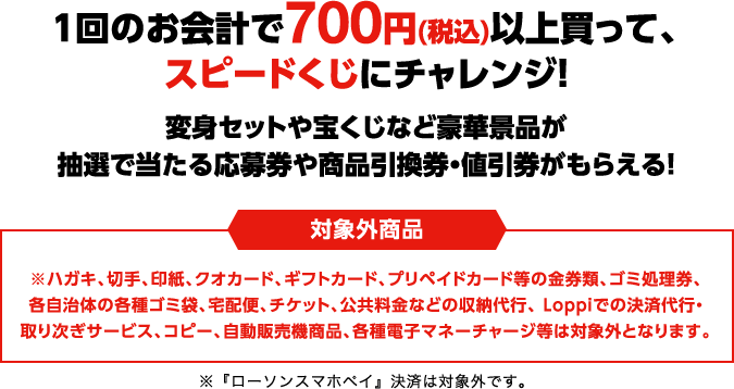 ハガキ、切手、印紙、クオカード、ギフトカード、プリペイドカード等の金券類、ゴミ処理券、各自治体の各種ゴミ袋、宅配便、チケット、公共料金などの収納代行、Loppiでの決済代行・取り次ぎサービス、コピー、自動販売機商品、各種電子マネーチャージ等は対象外となります。