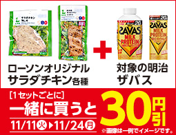サラダチキン各種と対象の飲料を同時購入で30円引