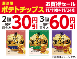対象のお菓子を2個同時購入で30円引、3個同時購入で60円引