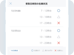 ※「!」が表示されている日時は予約する商品内に在庫がご用意できない商品があります。タップして内容をご確認の上、日時の変更もしくは商品の変更・削除をしてください。