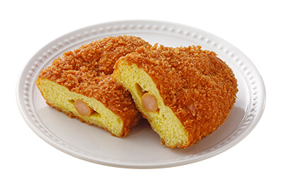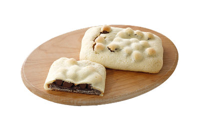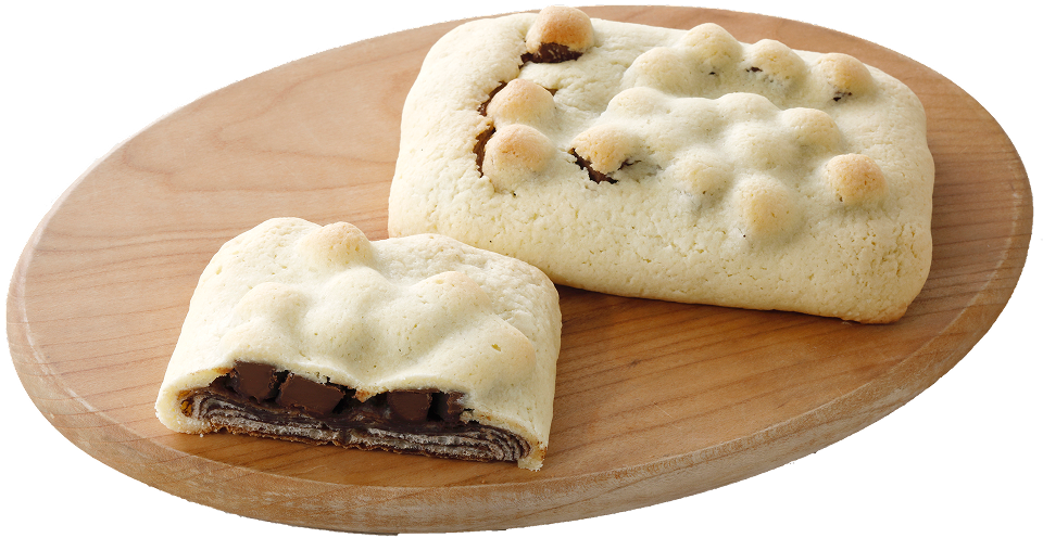 チョコクリームを折り込んだ生地にダイスチョコを乗せ、淡路島牛乳を使用したビスケット生地をかぶせて焼き上げました。ゴロゴロとしたダイスチョコの食感がアクセントの菓子パンです。