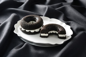 竹炭とブラックココアを配合した黒いクッキーシュー生地に、バニラクリームを入れたシュークリームです。シュー生地の上に白色のグレースと粉糖をかけました。