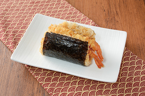 尾つき海老天(2尾)を使用した天丼をイメージしたおにぎりです。ごはんと海老天に甘酢生姜を挟むことで味にアクセントをつけました。