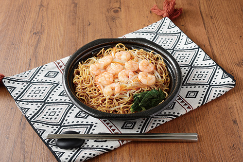 ぷりぷりとした食感の海老を10尾トッピングした上海風の焼そばです。麺をオイスターソースとごま油で味付けをし、食欲をそそる香りに仕立てています。