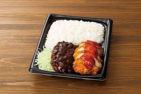 肉の厚みにこだわったフライドチキン「まんまる鶏」とハンバーグを組み合わせた肉を堪能できる弁当です。「まんまる鶏」にはガーリックトマトソース、ハンバーグにはデミグラスソースをかけておりごはんとの相性がぴったりです。