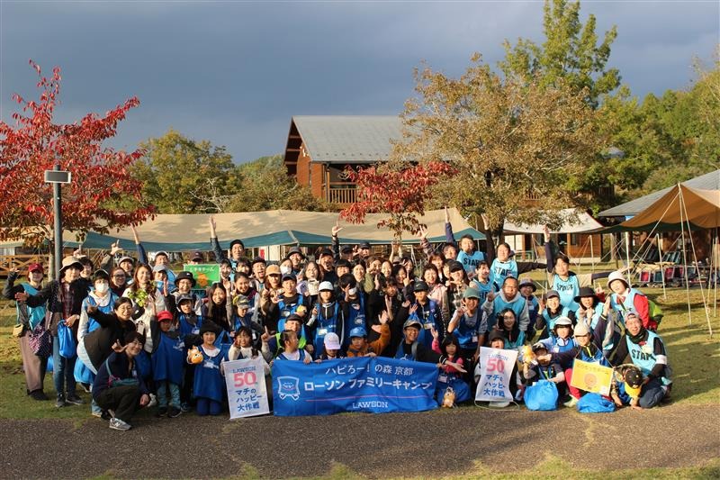 今年は50周年記念として、「ローソン ファミリーキャンプ」と題し、2025年11月2日(日)に京都府内のひとり親家庭の親子20組45名をご招待したイベントを開催しました。当日はバーベキューのほか、不要な木を伐採する森林整備体験や木を使った工作など親子で楽しめるさまざまなプログラムを実施し、全国から募集したローソン社員15名が応援社員として参加し、子どもたちと一緒に活動を行いました。