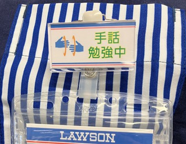 受講者には、店舗でユニフォームにつけられるよう、手話言語を使う当社社員の意見を参考に一般財団法人全日本ろうあ連盟の「手話マーク」をデザインに入れた、「手話勉強中バッジ」を配付しました。