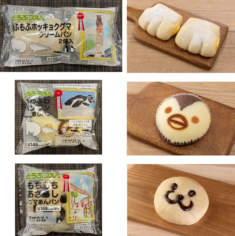 上から、「もふもふホッキョクグマクリームパン 2個入」、「ふわふわペンギン蒸しパン」、「もちもちあざらしゴマあんパン」 |
