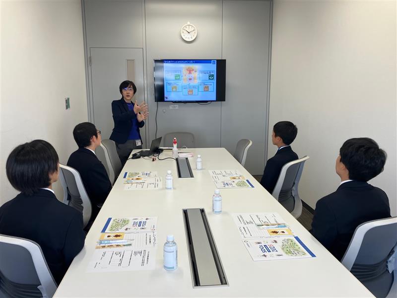 「ローソンSDGs教室」は、中高生の皆さんに、ローソンのSDGsに関する取り組みを楽しく学んでいただくことを目的に実施しているプログラムです。21回目となる今回は、茨城県立水海道第一高等学校附属中学校の生徒さん4名がお越しくださいました。
