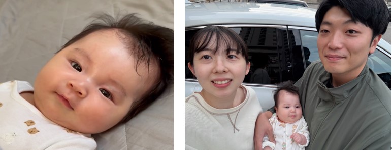 「産休取得前から赤ちゃんを最優先に考えていただき、同僚でもある夫 が立ち会う中で、出産することができました。家ではやさしいパパ、仕事では仲間へやさしく自身には厳しい、支店長の〇〇さん(上長)のような人になろうと、今は夫が全力でがんばっています。私も復帰したら仕事は全力、家ではやさしいママを目指しています!」