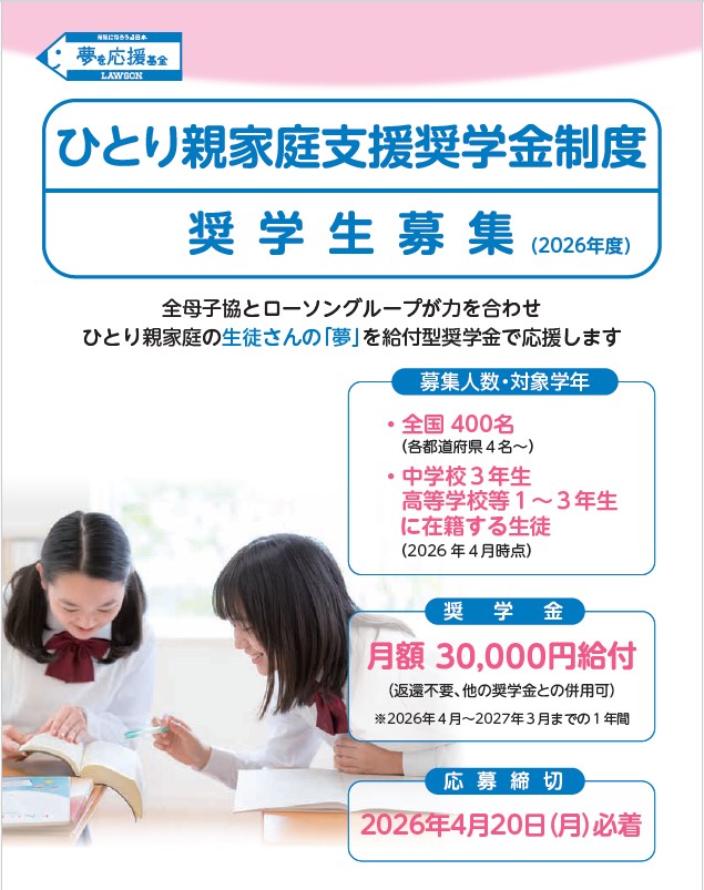 株式会社ローソンが創設した「夢を応援基金(ひとり親家庭支援奨学金制度)」では、2026年4月20日(月)までの申請書類必着で、2026年度の奨学生400名を募集します。