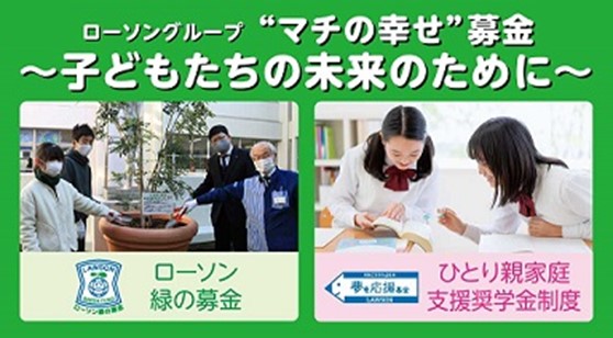 ローソングループは「子どもたちの未来のために」をコンセプトに、「ローソングループ“マチの幸せ”募金」として、「ローソン緑の募金」、「夢を応援基金(ひとり親家庭支援奨学金制度)」を実施しています。お客さまからお預かりした募金の全額は、全国の小・中学校、特別支援学校などの緑化活動や森林整備活動、子どもたちの教育サポートや健全な育成に向けた支援などに役立てられています。