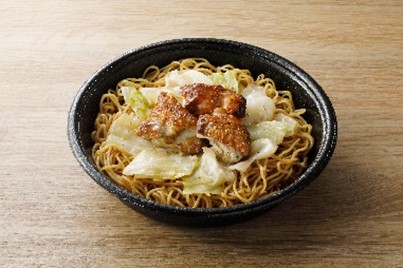 「スパイシー塩焼そば(骨付鳥味)」(税込599円) 香川県の名物「骨付鳥」をイメージした味付け鶏肉を乗せた塩焼そばです。骨付鳥と一緒に食べることが多いキャベツを組み合わせました。 |