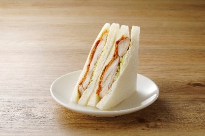 「とりサンド(骨付鳥味)」(税込408円) にんにくとコショウの味付けをメインに、鶏ガラスープなどで旨味も加えた鶏モモ肉を使用してサンドイッチに仕立てました。お店で食べる雰囲気をイメージして、ガーリックペッパーオイルに絡めた千切りキャベツを一緒にサンドしました。 |