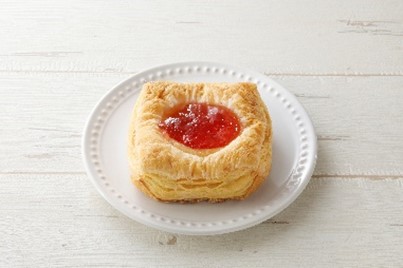 「ザクザクとしたいちごタルトデニッシュ(香川県産苺のジャム)」(税込200円) クッキー生地の上にパイ生地を乗せて焼き上げた、タルトデニッシュです。香川県産苺のジャムと、相性の良い甘味を抑えたカスタードクリームを使用しています。 |