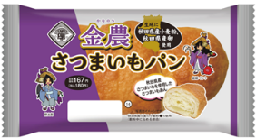 秋田県産小麦粉と卵を使用したデニッシュ生地を焼いたあとスライスして、秋田県産のさつまいも(紅はるか)を使用した濃厚な甘みが特長のさつまいものあんをサンドしました。
