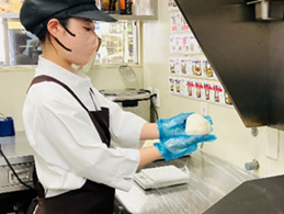 有事の際にもお客様に食品をご提供できるよう店内の厨房を活用した災害時専用メニューのおにぎり。水と米があれば作成が可能。 |