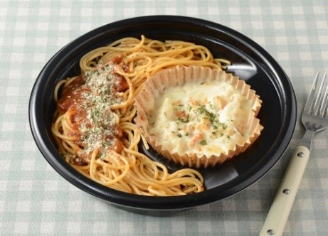 肉とトマトの旨みを引きたたせたミートソースパスタと、鶏もも肉、玉ねぎ入りのマカロニグラタンをセットにしました。 |