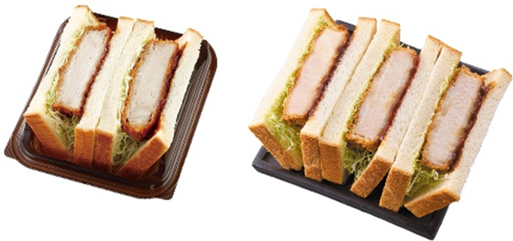「盛りすぎ!厚切りロースカツサンド」(税込495円) 従来品の「三元豚の厚切りロースカツサンド」と比較して、カツサンドの個数を約50%増量の3個入りにしました。 厚切りのロースとんかつに、野菜と果実で仕上げたフルーティーな甘さとすっきりした後味が特長の特製ソースを合わせました。 ※沖縄では仕様・価格が異なります。 ※店内調理サービス「まちかど厨房」導入店舗(約9,800店)にて発売。 |