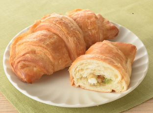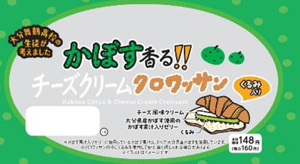 大分県立大分舞鶴高等学校の生徒さん考案 「かぼす香る!!チーズクリームクロワッサン」 (税込160円) くるみを巻き込んで焼成したクロワッサンに、チーズクリームと大分県産かぼすの果汁を使ったかぼすゼリーをサンドしました。 |
