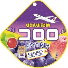 コロロ SKYTIME味(ももとぶどう) 40g 税込 160円 JAL機内食で人気の飲料「スカイタイム」と独特の食感が特長のグミ「UHA味覚糖 コロロ」のコラボレーション商品です。スカイタイムのももとぶどう味を、プチっと弾ける柔らかい食感が特長のコロロで再現しています。JALの飛行機をデザインしたパッケージに入れました。 |