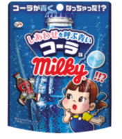 「不二家 ミルキー しあわせを呼ぶ青いコーラ味」税込194円 青色のクチナシ色素を生地に練りこんだ青色の色合いが特長の、コーラ味のミルキーです。 |