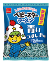 「おやつカンパニー しあわせを呼ぶ青いベビースターラーメン うましお味」税込160円 ※ナチュラルローソンでの発売はありません。 味はうましお味ながら、色は青色のベビースターラーメンです。 ベビースターラーメンのキャラクター「ホシオくん」も限定カラーの青色パッケージとなっています。 |