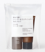 「無印良品 精油の香り シャンプー&コンディショナー お試しセット ひのき&ラベンダーの 無印良品「精油の香りシリーズ」初の携帯用ミニサイズのシャンプーとコンディショナーが持ち運びに便利なケースに入ったセットです。 【セット内容】 ・精油の香り シャンプー ひのき&ラベンダーの 香り 50g×1 ・精油の香り コンディショナー ひのき&ラベン ダーの香り 30g×1 |