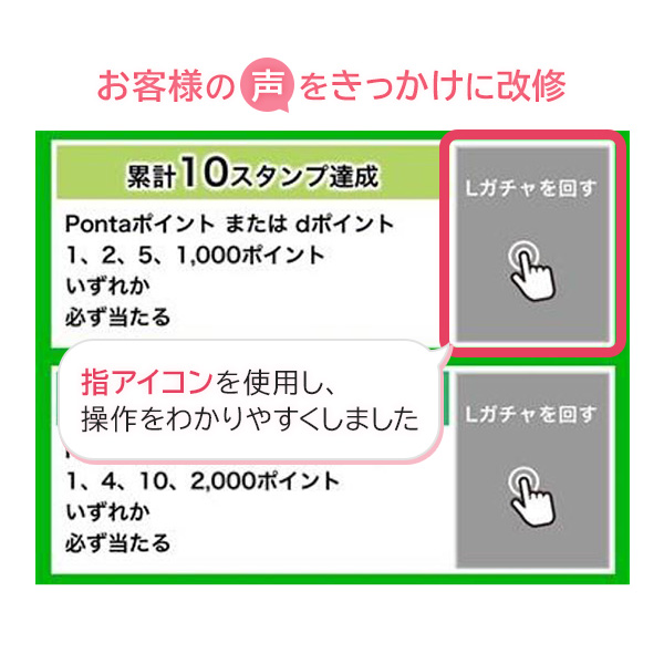 お客様から「アプリでLガチャ」についてどこから回せばよいのか分からないというお声があり、操作を視覚的に分かりやすくするため指のアイコンを使用し画面改修をしました。