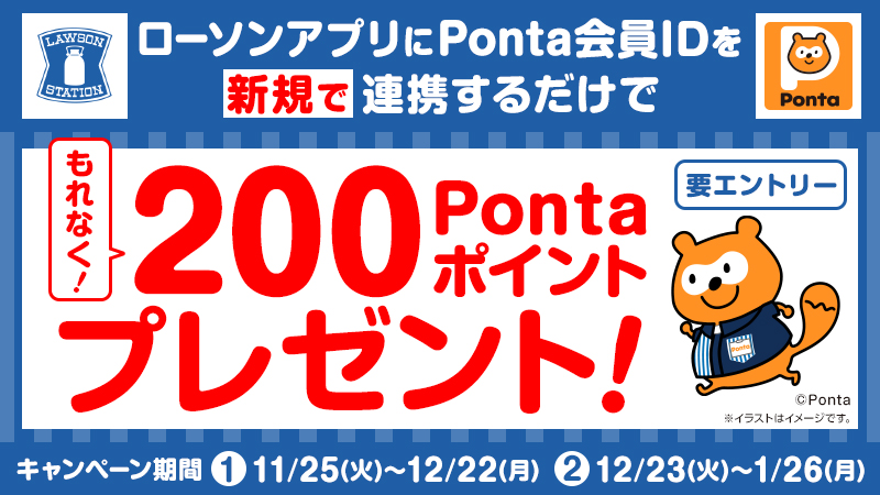 キャンペーン期間中に本ページよりエントリーの上、ローソンアプリではじめてPonta会員ID連携した方に、もれなく200Pontaポイントをプレゼントいたします。