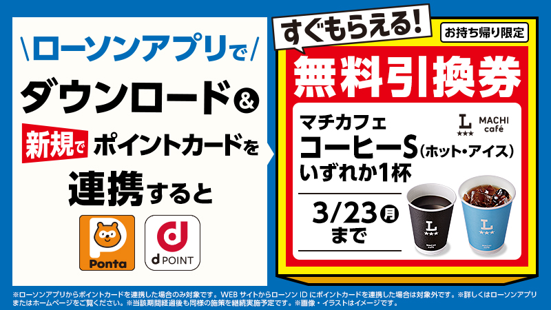 ローソンアプリをダウンロードして、新規でポイントカードを連携すると、対象の商品無料引換券がもらえます。