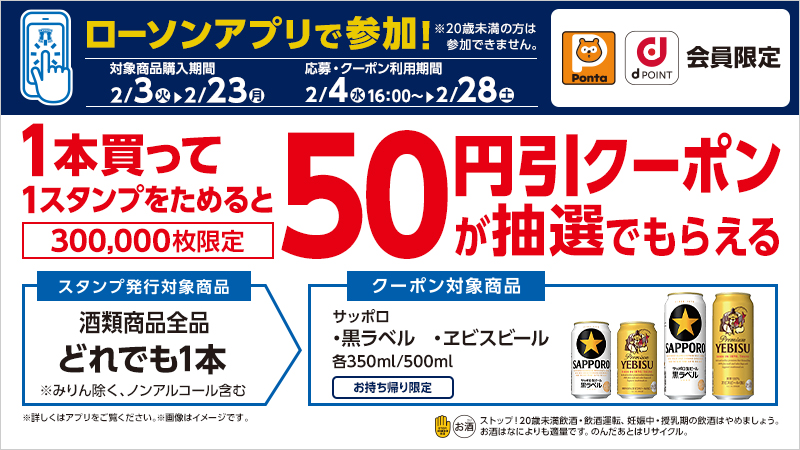 【お酒のキャンペーン】【ローソンアプリ限定】【20歳以上対象】対象のお酒を買って、サッポロ黒ラベル&サッポロヱビスビール各種(350ml / 500ml)に使用できる50円引クーポンを抽選でもらおう!