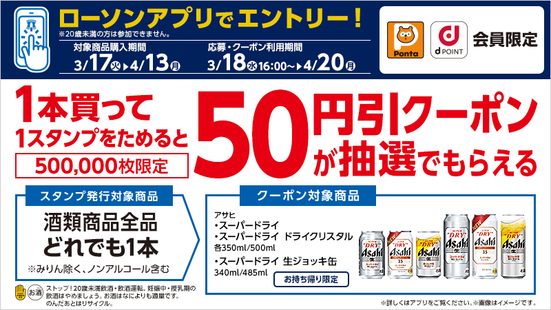 【お酒のキャンペーン】【ローソンアプリ限定】【20歳以上対象】対象のお酒を買って、アサヒ スーパードライ各種(350ml / 500ml)に使用できる50円引クーポンを抽選でもらおう!