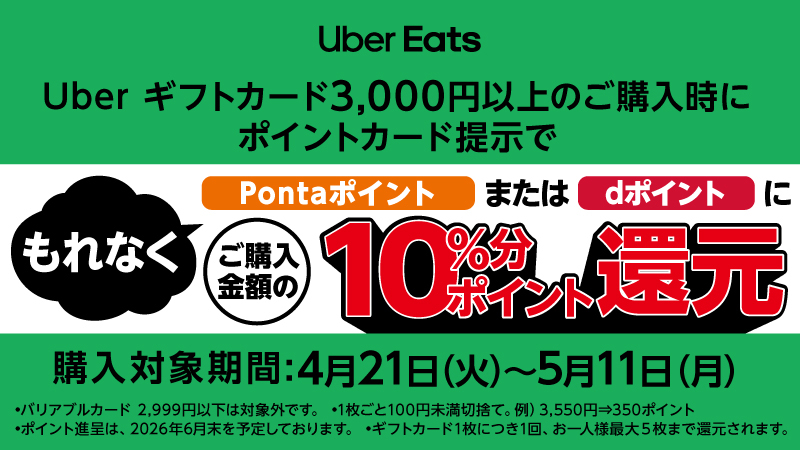ローソンで Uber ギフトカード3,000円以上のご購入時に、会員カード(Pontaカード/dポイントカード)を提示した方に、ご購入金額の10%分のPontaポイントまたはdポイントをプレゼント!