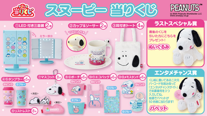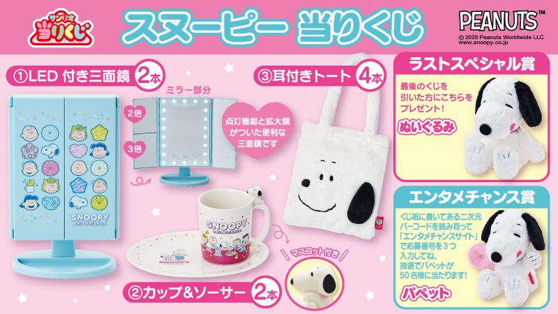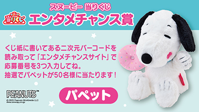 スヌーピーとピーナッツフレンズが大好きなドーナツをあしらった、キュートなデザインの当りくじだよ!