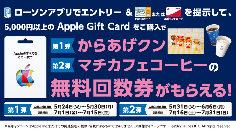 ローソンアプリでエントリーをし、2022年5月24日(火)~6月6日(月)の間にPontaカードまたはdポイントカードを掲示して 5,000円以上の Apple Gift Card をご購入いただくと、もれなくからあげクンやマチカフェコーヒーの無料回数券をプレゼント!