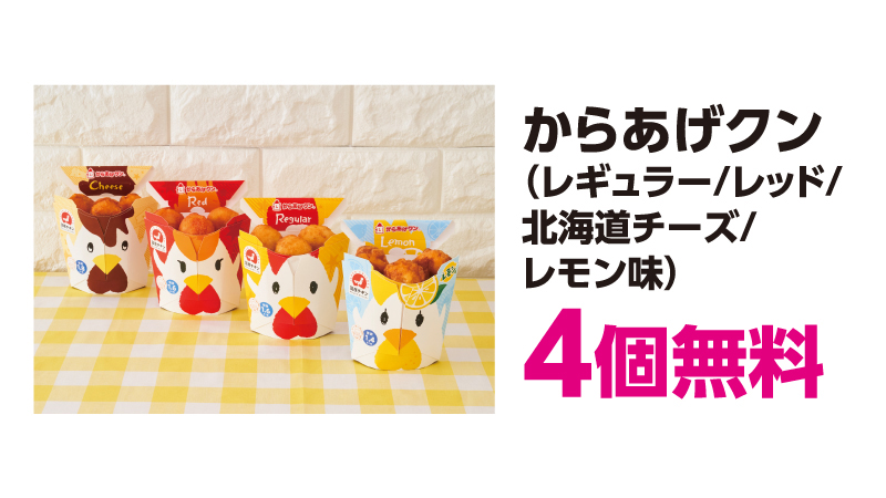・無料回数券:からあげクン(レギュラー/レッド/北海道チーズ/レモン味)4個無料