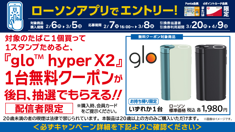 【gloのキャンペーン】【ローソンアプリ限定】対象のたばこ1個買って「glo hyper X2」1台無料クーポンを抽選でもらおう!