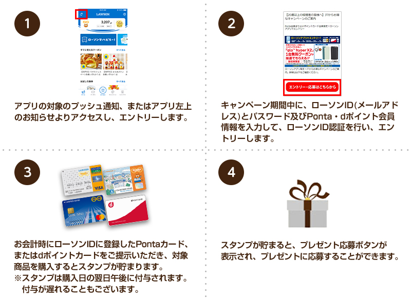 ・購入期間中、ローソンで会員カード(Pontaカード/dポイントカード)をご提示の上、対象商品を購入されると、翌日午後にスタンプがたまります。