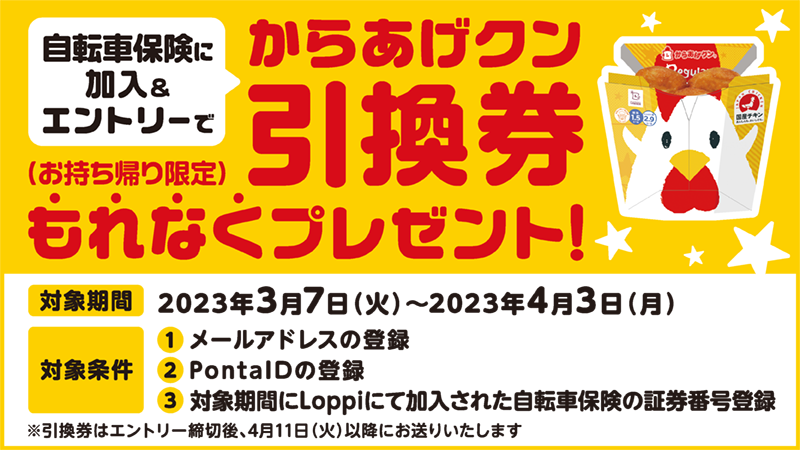 ②対象期間中(2023年3月7日(火)から4月3日(月))にローソンLoppiにて自転車保険に加入し、店頭にて保険料のお支払いが完了している方
