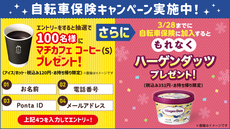 ※マチカフェコーヒー(S)の抽選にエントリーして当選された方と、さらに期間中に自転車保険に加入された方は、それぞれ別々のメールで引換券を送付します。