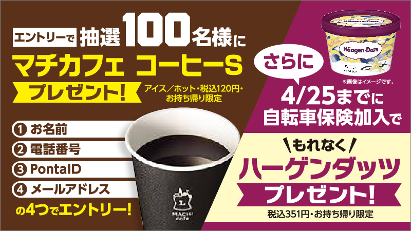 ※マチカフェコーヒー(S)の抽選にエントリーして当選された方と、さらに期間中に自転車保険に加入された方は、それぞれ別々のメールで引換券を送付します。