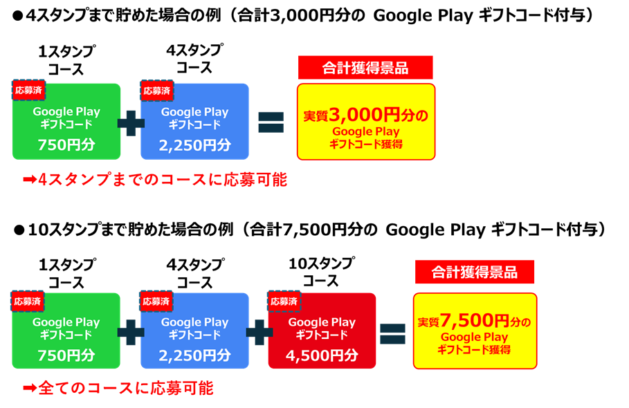 ※累計10スタンプで、全コース同時応募すると7,500円分の Google Play ギフトコードプレゼント。