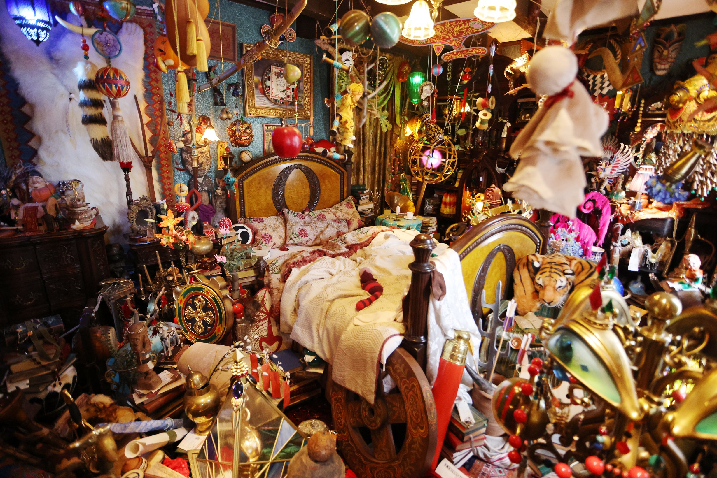 ▲世界中から集めた、魔女除けのガラクタが所狭しと広がっている。「これはいったい…?」と思わざるをえない不思議な表情をしたガラクタの中には、日本らしさを感じるモノもある。
