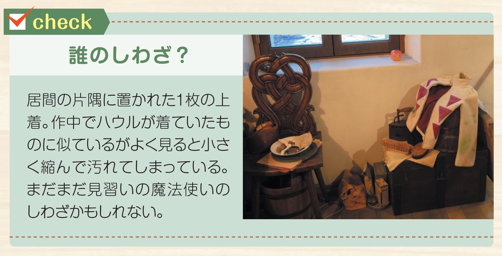 ▲衣裳部屋やアトリエなど、作品には登場しない空間も楽しめるのがジブリパークの面白さ。流行りの服や脱いだままの靴から、ハウルの暮らしぶりや性格まで想像できる。
