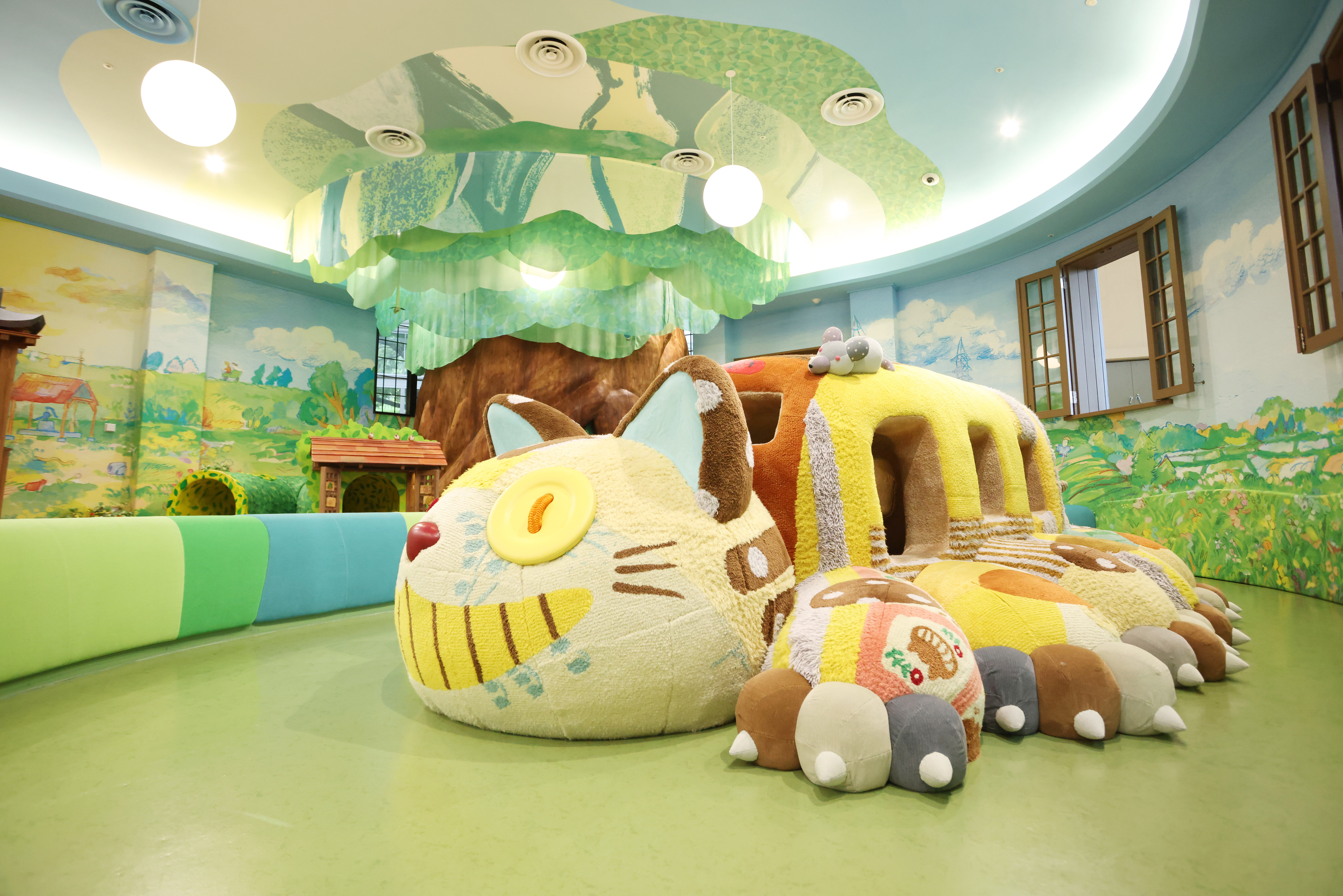 ▲ジブリの大倉庫にある「ネコバスルーム」は『となりのトトロ』の世界を表現した遊び場。その中心にいるカラフルなパッチワーク調のネコバスは、このジブリパークオリジナル。ここでしか会うことができないもので、バスの中の毛もふわふわ。子どもたちは、ネコバスと一緒に思いっきり遊びまわれる!