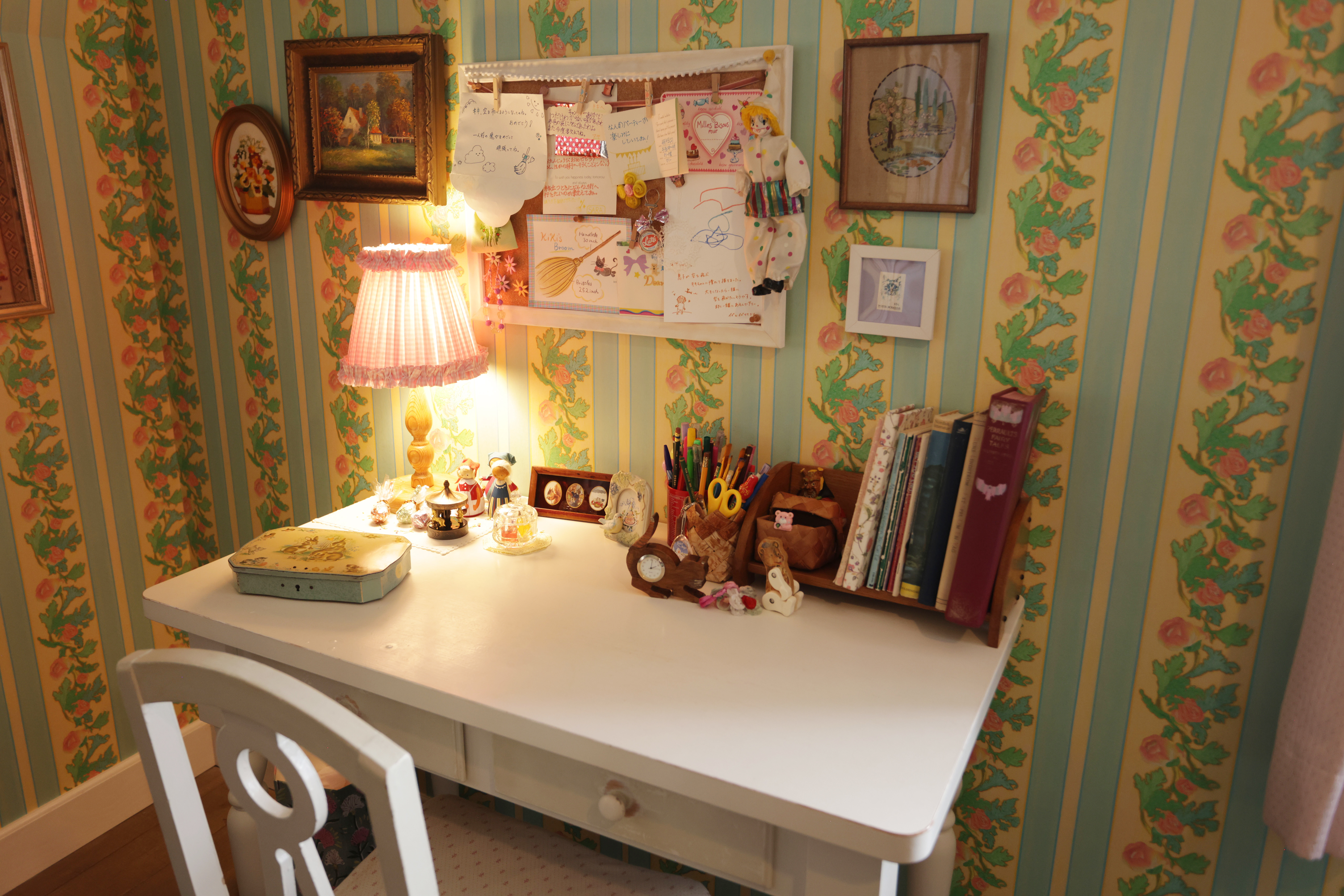 ▲机の前の壁に飾られているボードには、お友達から届いたキキへのメッセージが貼られているので、ぜひ読んでみてほしい。