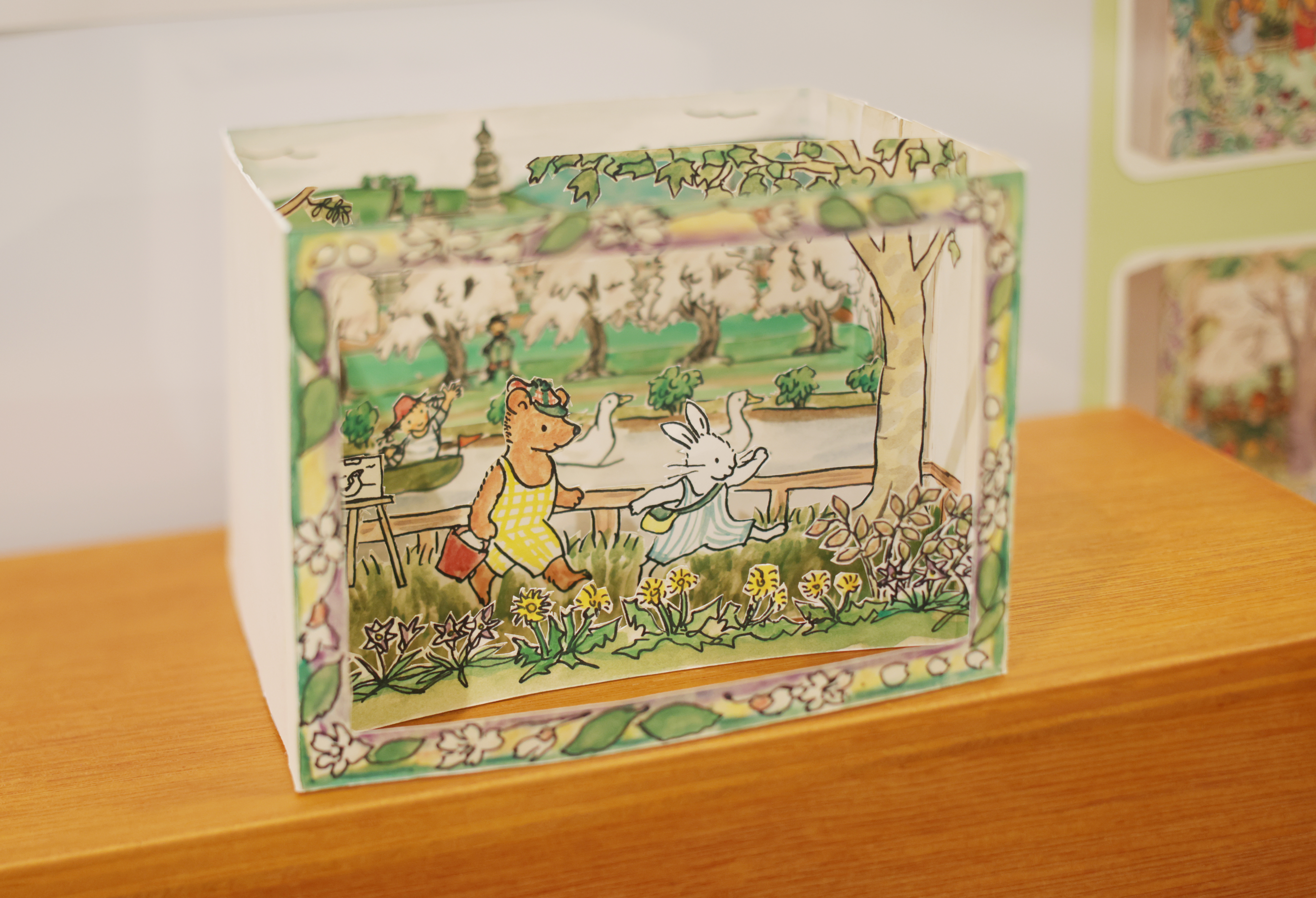 「『山脇百合子の仕事部屋』展~ごちゃごちゃから見えるもの~」で展示中の絵箱にも春らしい風景が加わっています。山脇さんの作品からも春の暖かな空気感をお楽しみください。